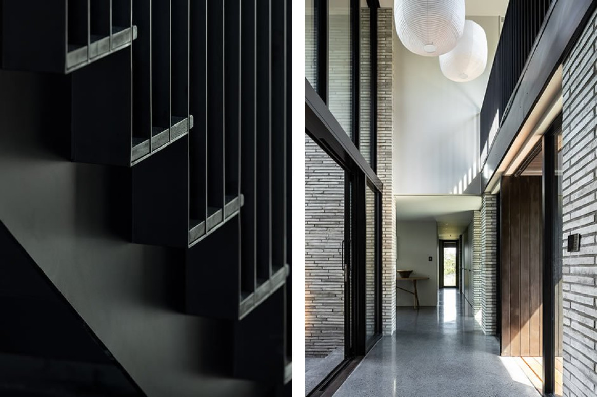 The exterior finishes feature a beautifully proportioned Danish brick in a concrete colour, with a charred exterior timber cladding that was 'fumed' on site using a special Japanese burning technique. Dynamically cutting through these organic materials was the hard-nosed element of the black joinery selection, which also featured in other key areas of the architectural design.