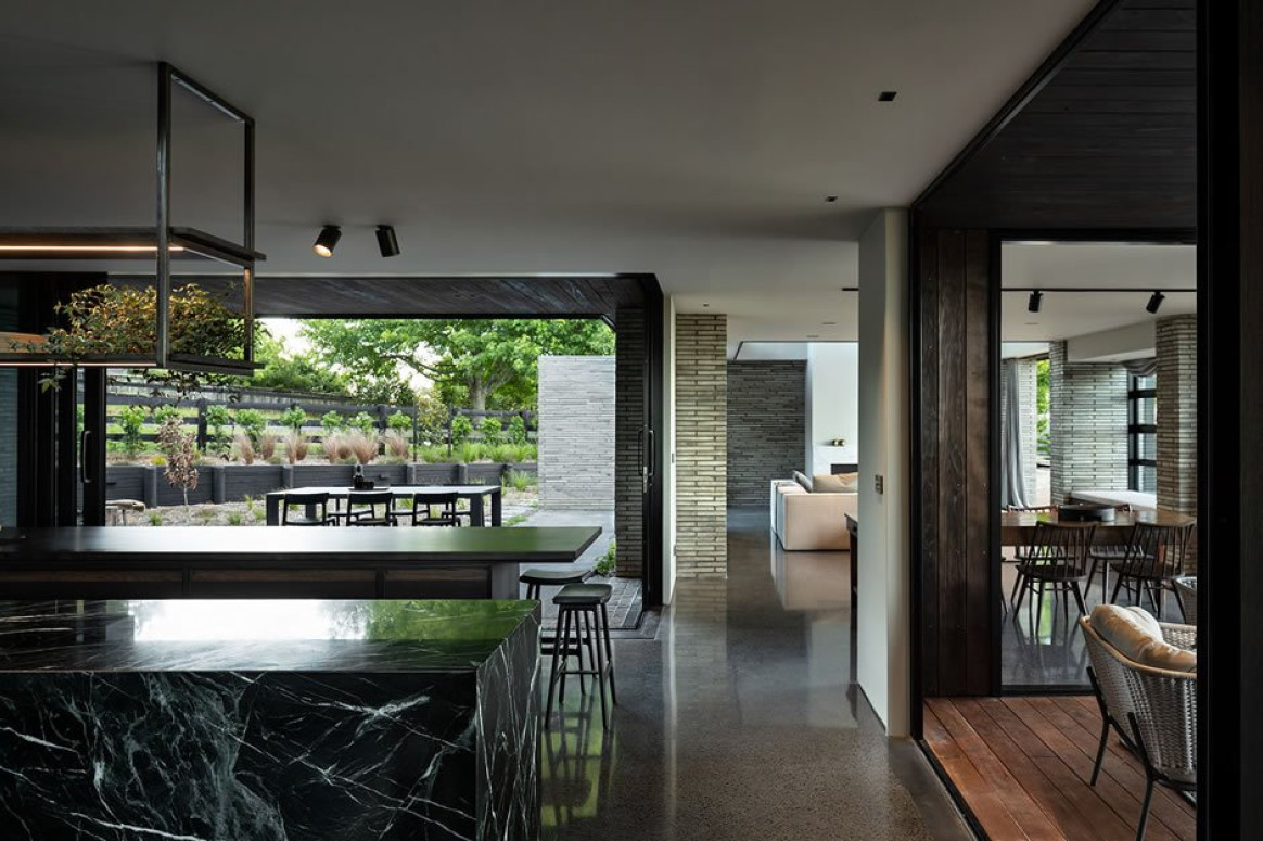 The exterior finishes feature a beautifully proportioned Danish brick in a concrete colour, with a charred exterior timber cladding that was 'fumed' on site using a special Japanese burning technique. Dynamically cutting through these organic materials was the hard-nosed element of the black joinery selection, which also featured in other key areas of the architectural design.