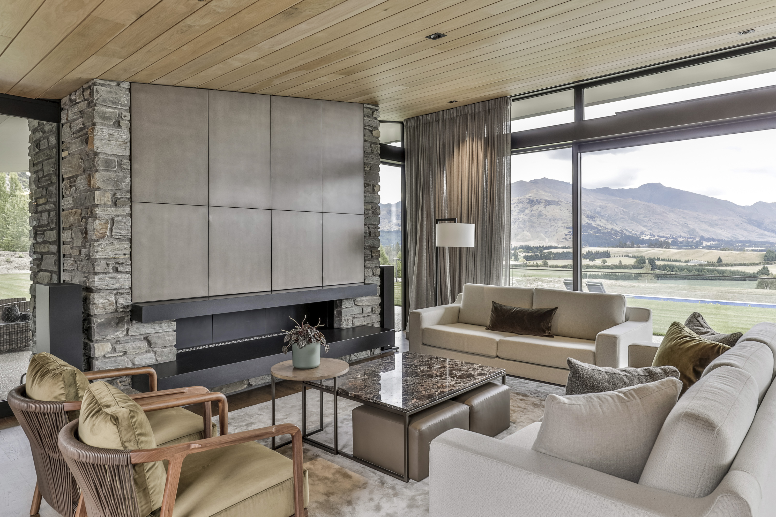 As time has moved on the developed house needed another design brief. This was to focus on blurring the threshold of interior and exterior. To connect the unused pool house to the main house, spatially including the disconnected pool, landscape design to enhance and finally looking practically to utilise the pool house to its potential for guests visiting and drinks, for parties and everyday family living. Thus, a pavilion was born, interconnecting with covered walkways. Places to sit, cloistered moments and views. Fireplaces and Barbeques, kitchen and shower room. A wrap around Barcelona Pavilion. Painted steel beams connect through the buildings, the use of the Kayne-Maile provides transparent screening that also served as a barrier for light and air filtration. Louvre Tech screening shelters predominant areas so to be multifunctional. The kitchen, simple and timeless, but with an element of surprise through the bronze mirrored panels. Taj Mahal stone providing a creamy, tobacco and khaki colour palate to draw from. The Shower room echoing the kitchen yet in a different application with tobacco tiles and the same stone. Another wonderful collaboration with the talented Johnston Architects, who we worked closely with on this project to deliver a truly special result. A happy client utilising their space, every day in a practical way.